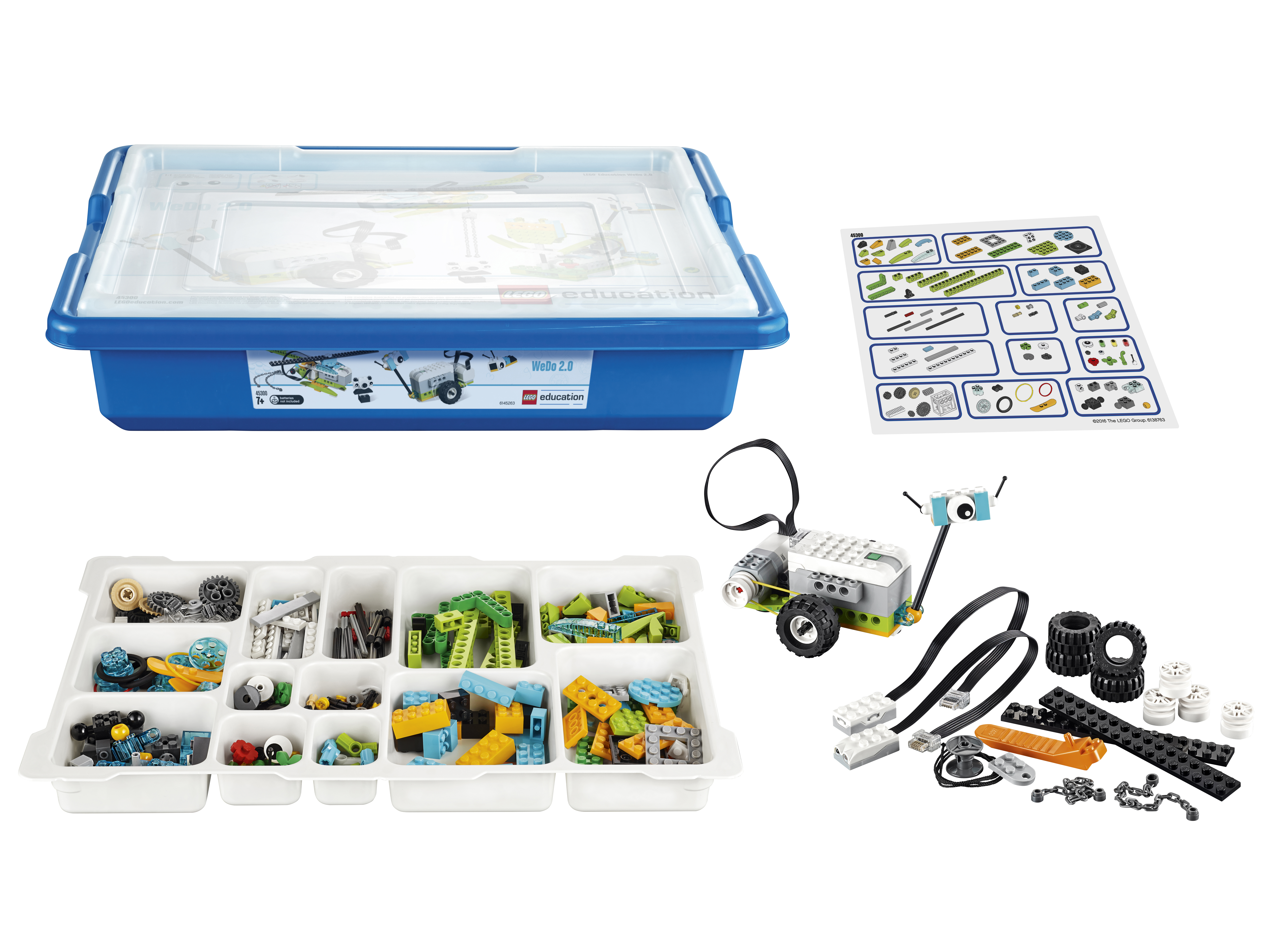 Базовый набор WeDo 2.0, ПО и Комплект учебных проектов представляют собой готовое образовательное решение, поощряющее любопытство учеников и развивающее их навыки научной деятельности, инженерного проектирования и программирования. Базовый набор поставляется в удобной для использования в классе пластиковой коробке. В комплект поставки входят: СмартХаб WeDo 2.0, электромотор, датчики движения и наклона, детали LEGO, лотки и наклейки для сортировки деталей.